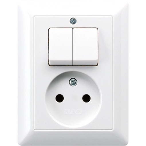JUNG combinatie stopcontact zonder randaarde/serieschakelaar, incl. afdekraam en geschikt voor een enkele ronde inbouwdoos, AS 500, alpine wit. Bedrading aansluiten met schroefklemmen. Duroplast, zeer krasvast en glanzend. Afmetingen: 80,5 × 105 mm. Meer informatie »