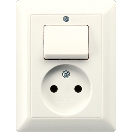 JUNG combinatie stopcontact zonder randaarde/wisselschakelaar, incl. afdekraam en geschikt voor een enkele ronde inbouwdoos, AS 500, crème. Bedrading aansluiten met schroefklemmen. Duroplast, zeer krasvast en glanzend. Afmetingen: 80,5 × 105 mm.
