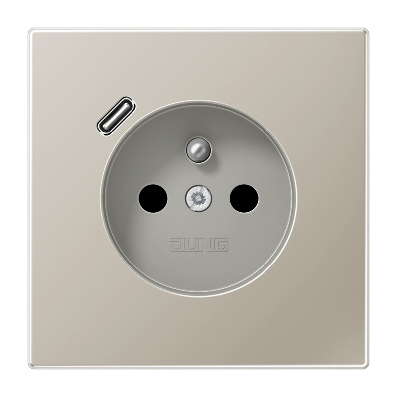 JUNG stopcontact met penaarde (België), verhoogde aanraakbeveiliging en één USB-C poort. LS 990, edelstaal (metaaluitvoering). Geschikt voor inbouwdozen met een minimale diepte van 57 mm. Excl. afdekraam.