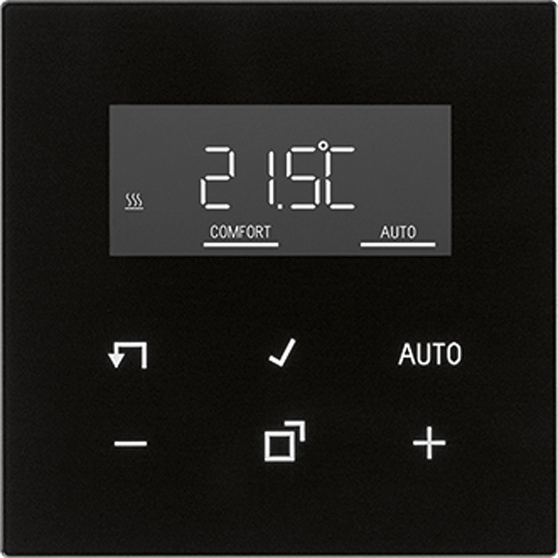 JUNG knop met display voor handmatige en tijdgestuurde regeling van de ruimtetemperatuur, LS 990, zwart. Front van echt glas. Excl. binnenwerk en afdekraam.