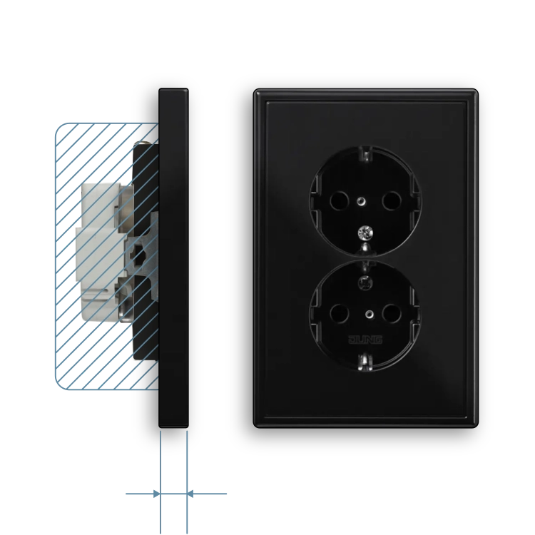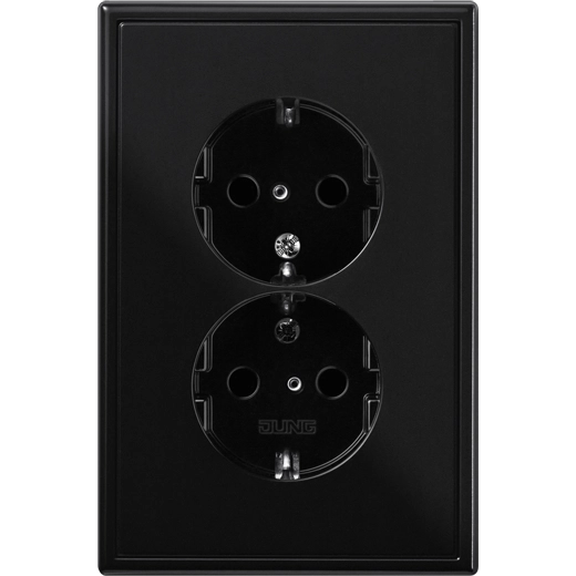 JUNG stopcontact 2-voudig met randaarde, incl. afdekraam. Geschikt voor een anderhalve (ovale) inbouwdoos, LS 990, zwart. Bedrading aansluiten met insteekklemmen. Duroplast, zeer krasvast en glanzend.