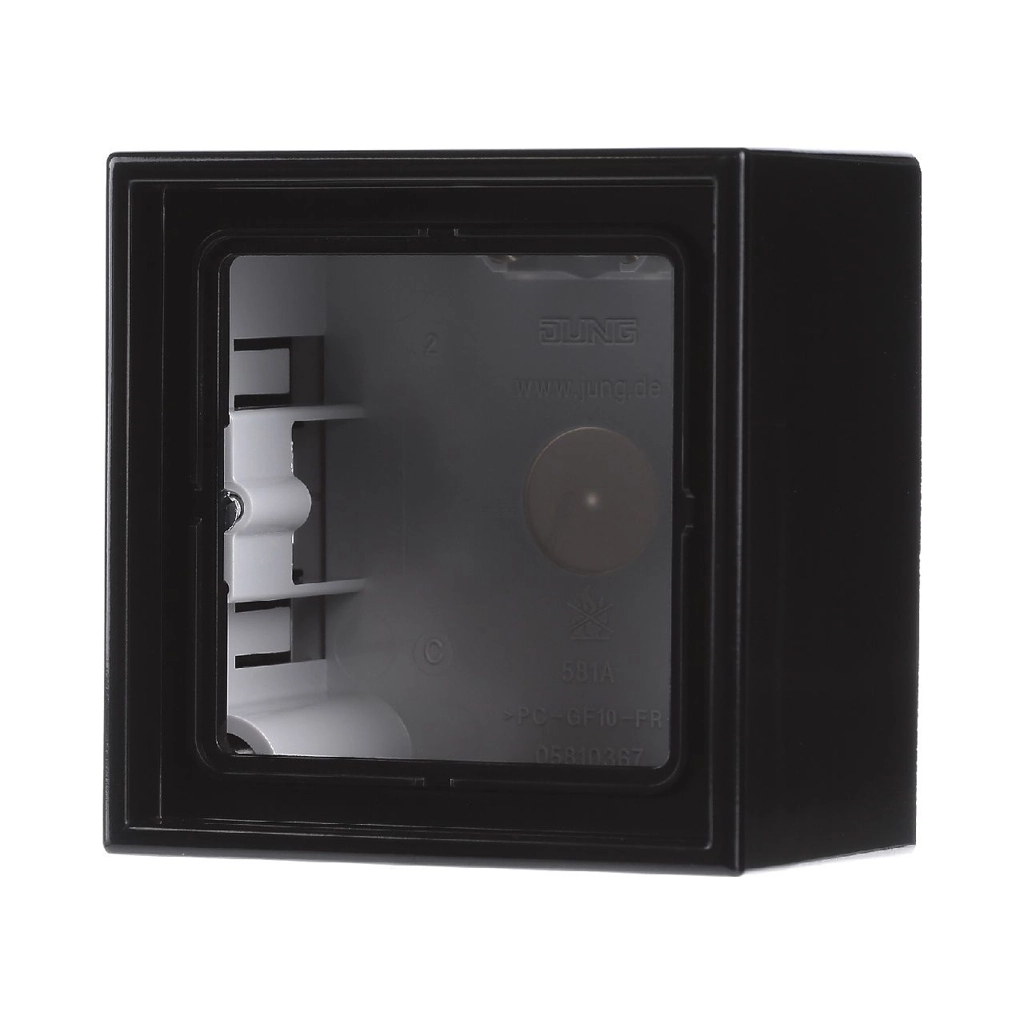 JUNG 1-voudige opbouwbak, voor basiselementen met afdekkingen uit de LS-range (zie lijst met uitgezonderde artikelen). Afmetingen: 81 x 81 x 47 mm. Duroplast, zeer krasvast. Incl. vlamwerende bodemplaat en afdekraam.