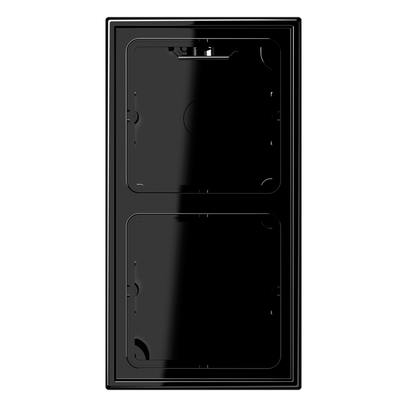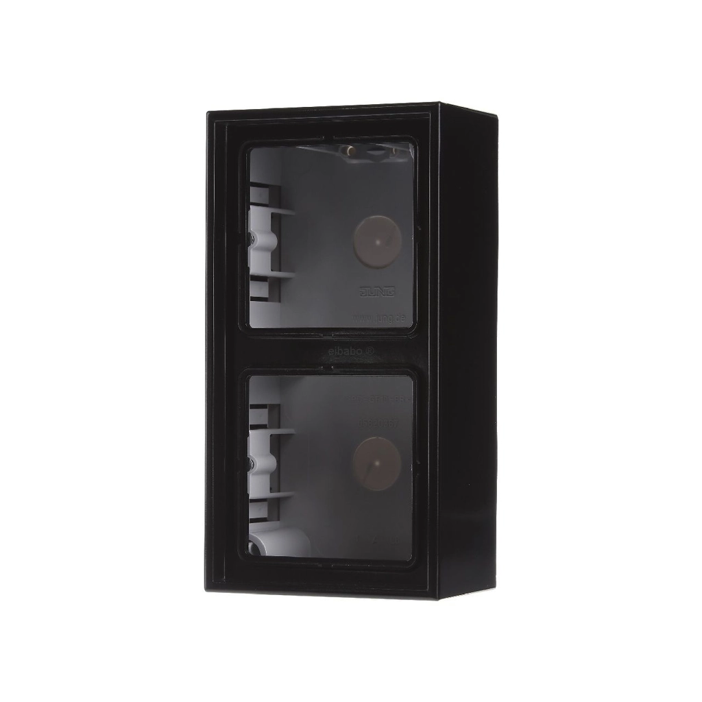 JUNG 2-voudige opbouwbak, voor basiselementen met afdekkingen uit de LS-range (zie lijst met uitgezonderde artikelen). Afmetingen: 152 x 81 x 47 mm. Duroplast, zeer krasvast. Incl. vlamwerende bodemplaat en afdekraam.