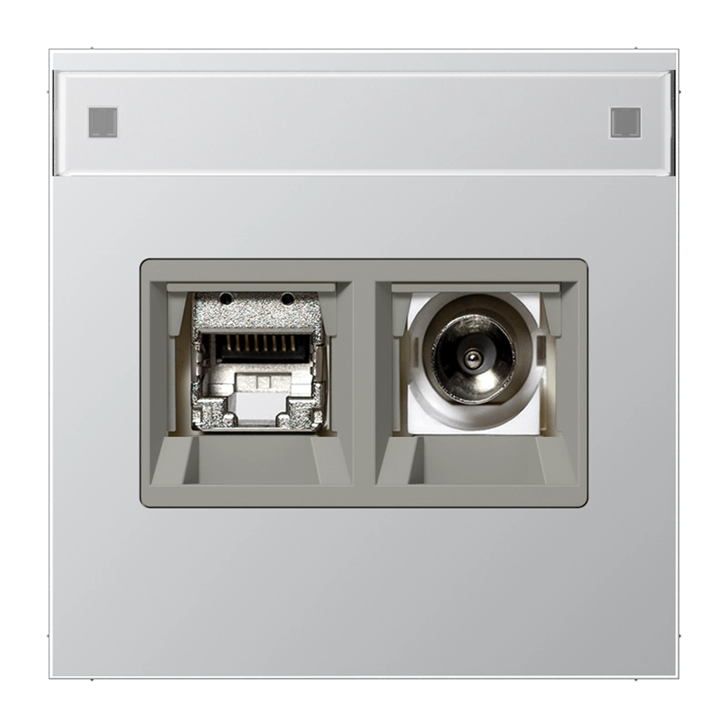JUNG communicatie-wandcontactdoos met RJ45 Cat.6A-aansluiting en COAX. Ideaal voor netwerk- en tv-aansluitingen (ethernet, internet, telefonie, digitale TV) in één compacte oplossing. Bespaart ruimte, installatietijd en bekabeling.
