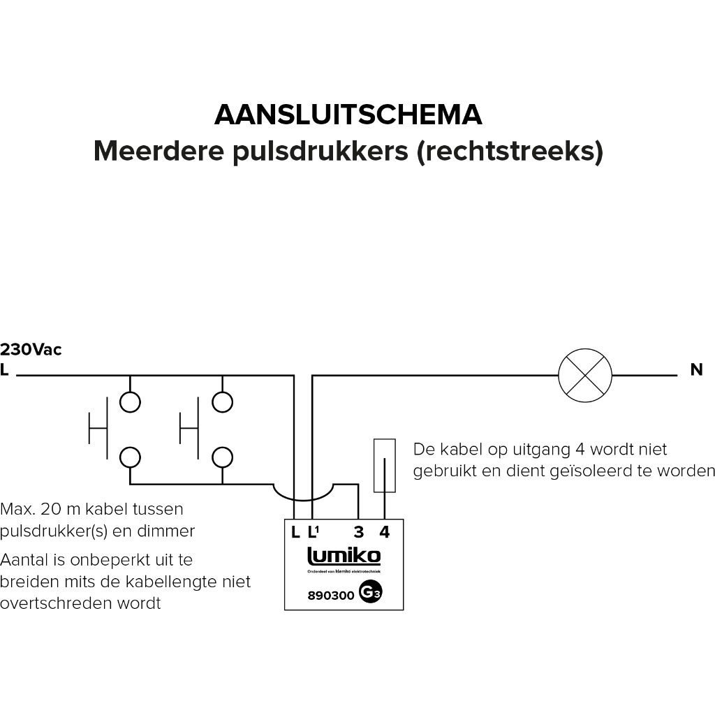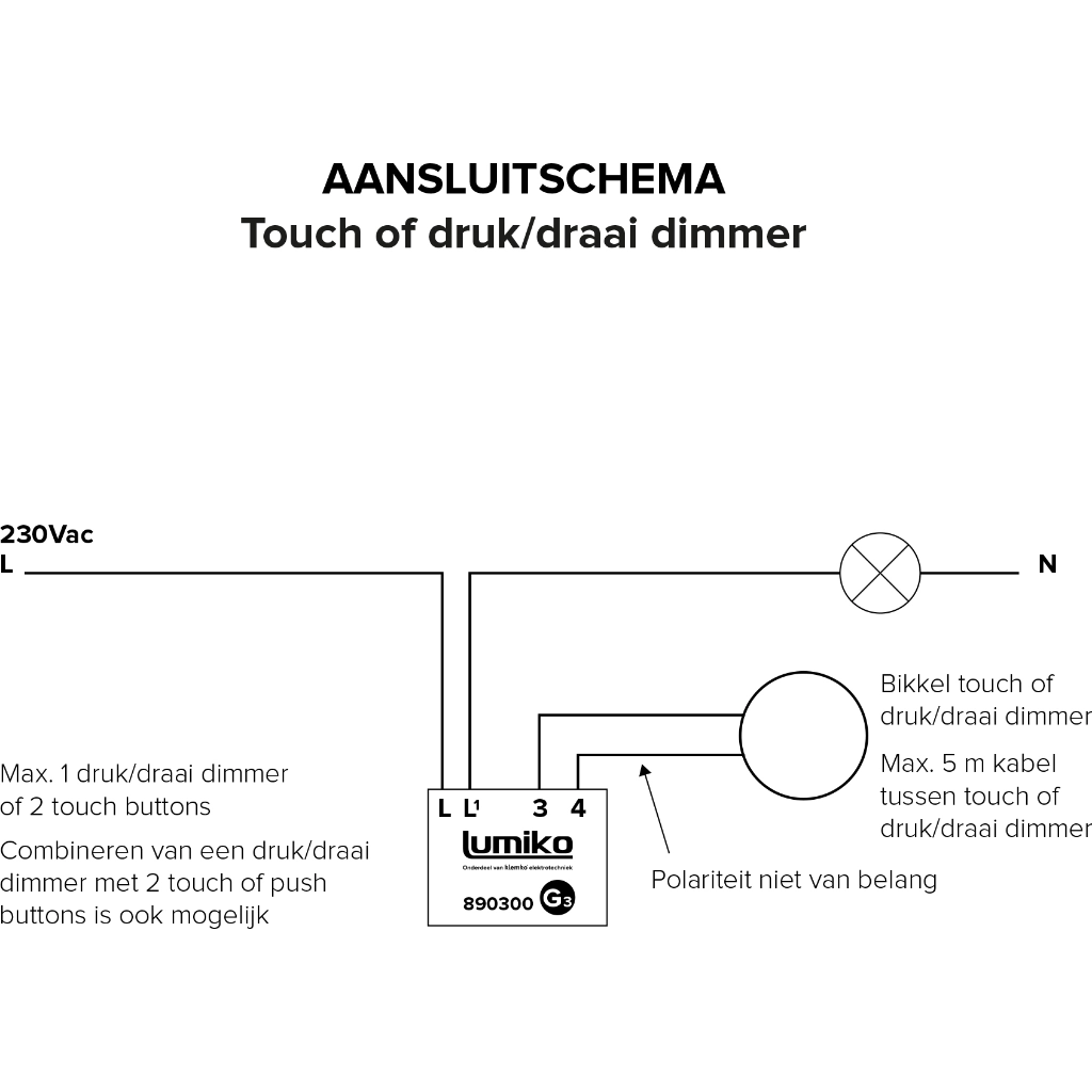 Klemko Bikkel, de Lumiko Bikkel G3 890300 LED mini LED-dimmer 200W, is een compacte inbouwoplossing met uitgebreide bedieningsmogelijkheden voor LED-toepassingen. Door het kleine formaat (30x27x11mm) kan de module eenvoudig worden weggewerkt in een inbouwdoos of armatuur, terwijl de bediening via één of meerdere pulsschakelaars verloopt.