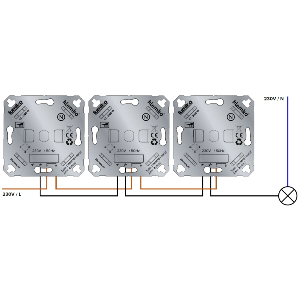Klemko Lumiko Master-Master LED dimmer 0 - 250 W, fase-afsnijding (RC). Geschikt voor de meeste A-merken schakelmateriaal en voor wisselschakeling met dimmers*. Let op: er mogen maximaal 8 spotjes of drivers (meerdere LED’s per driver is mogelijk) worden aangesloten.