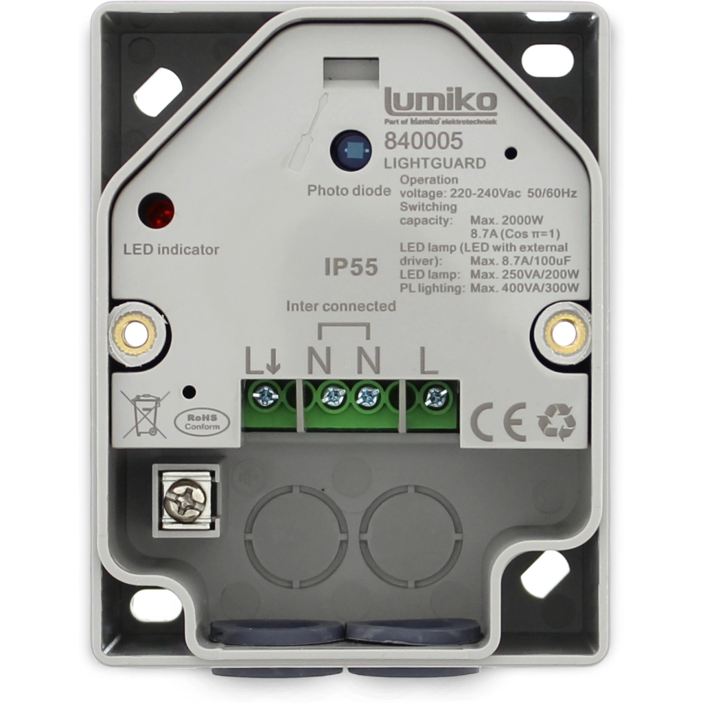 De Klemko LIGHTGUARD is een Lumiko opbouw schemerschakelaar voor 230V LEDverlichting in grijs, bedoeld om verlichting automatisch te schakelen op basis van de omgevingslichtsterkte. Het relais schakelt in zodra het begint te schemeren en weer uit wanneer het lichtniveau in de ochtend toeneemt, waardoor de verlichting op een logische en consistente manier wordt aangestuurd.