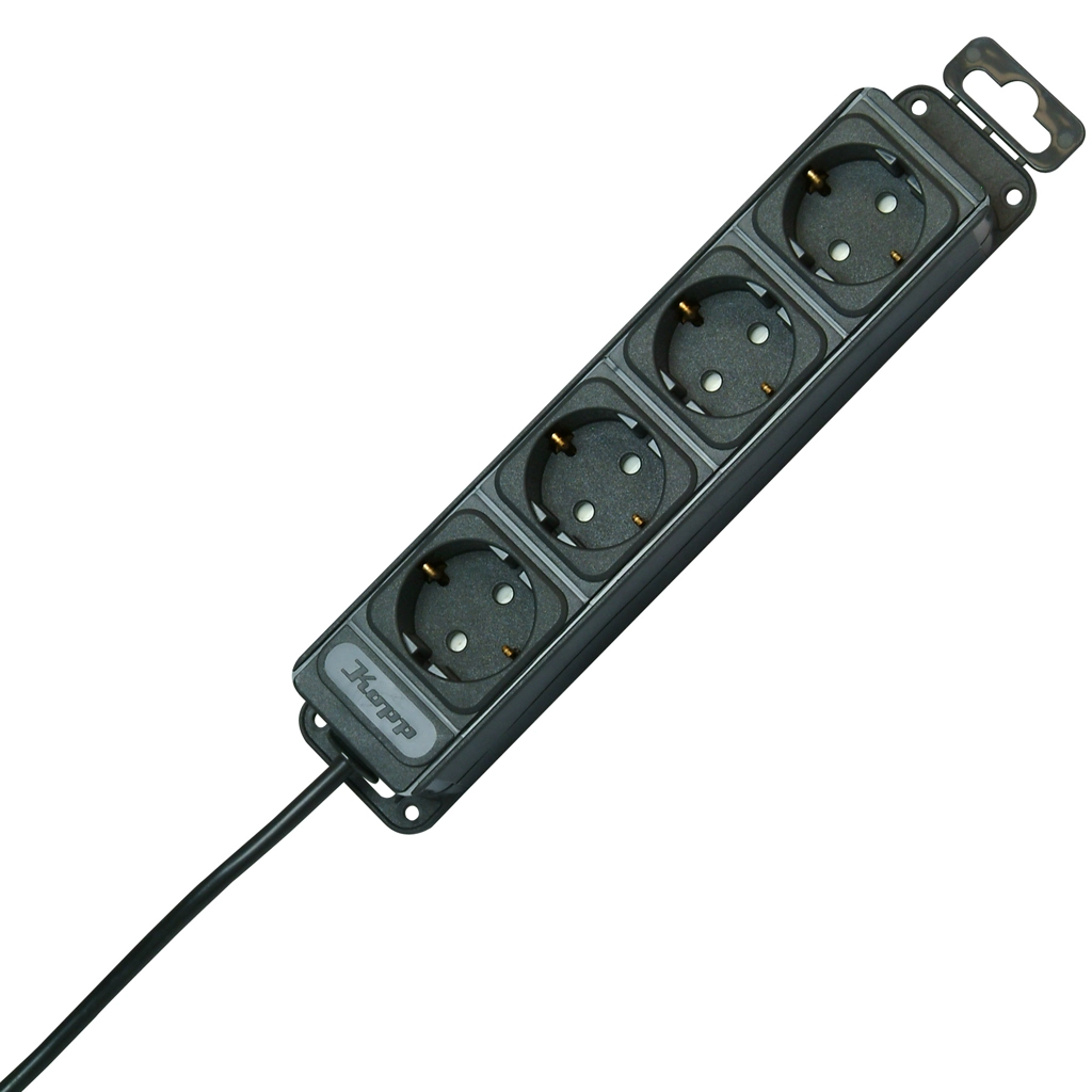 KOPP UNOversal 4-voudig stekkerdoos met RA en verhoogde aanraakbeveiliging, antraciet, 16 A. Met 1,4 meter snoer, type H05VV-F 3G1,5 mm². Stekkerstand: 90 graden.