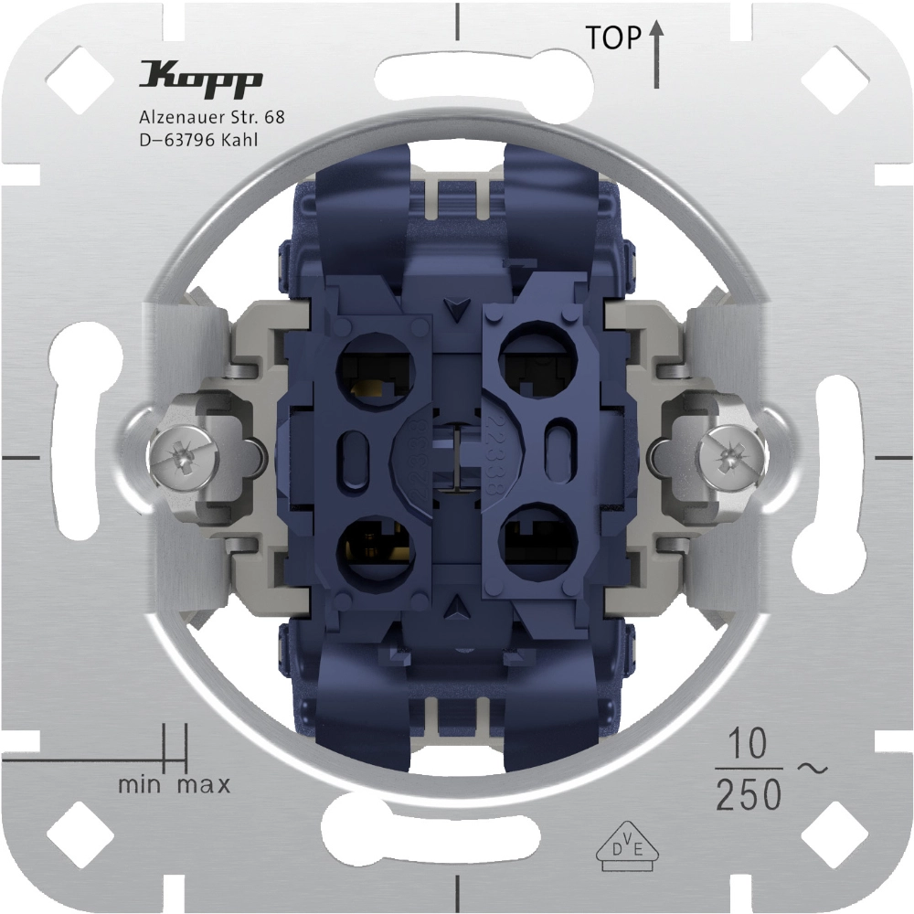 Kopp professionele serieschakelaar, 10 A, om twee afzonderlijke lichtpunten onafhankelijk te kunnen schakelen vanaf één plek. Niet geschikt voor wisselschakeling. Met klauw-/schroefbevestiging. Excl. schakelwip en afdekraam