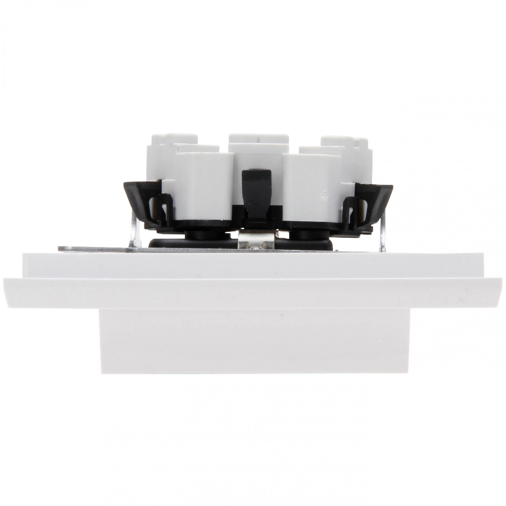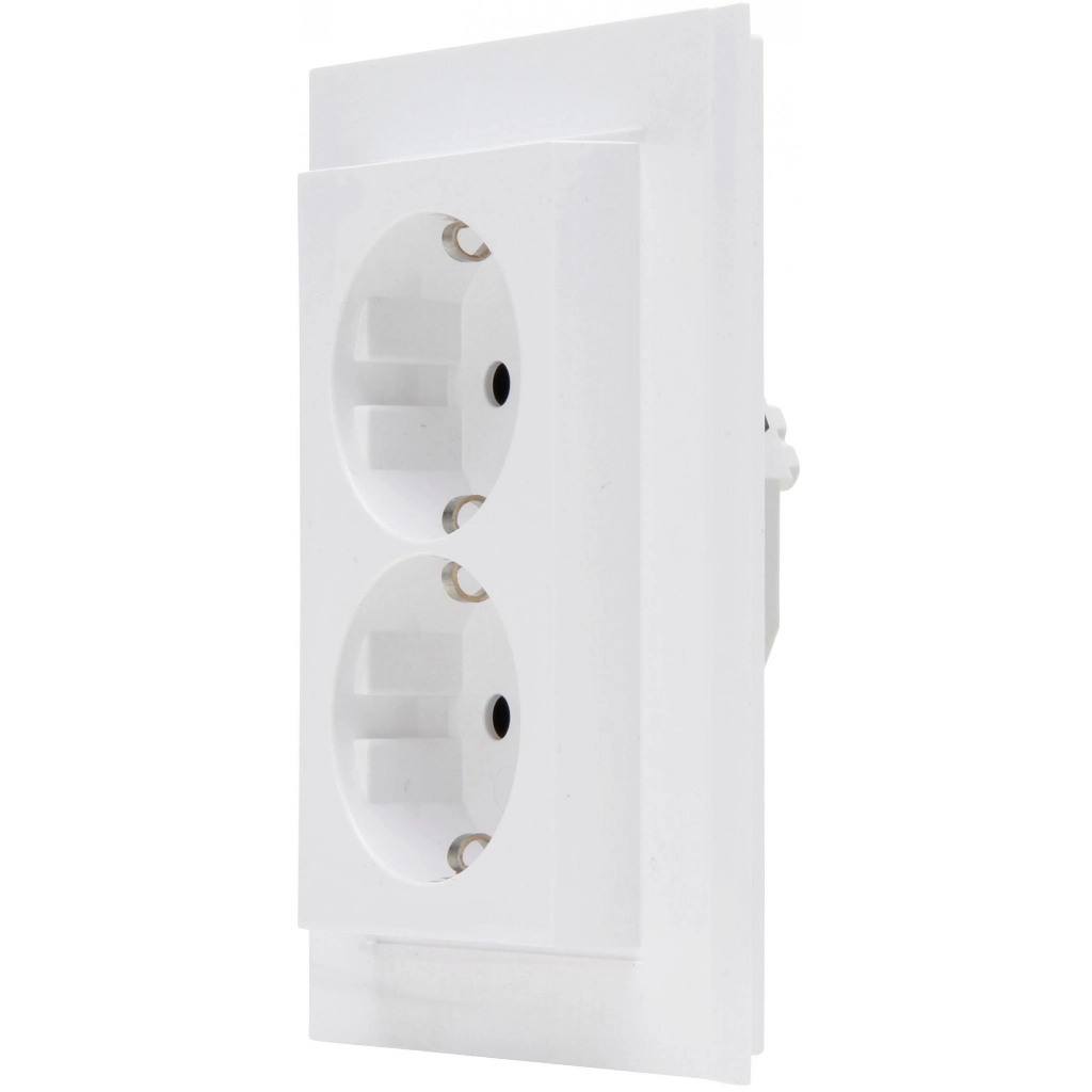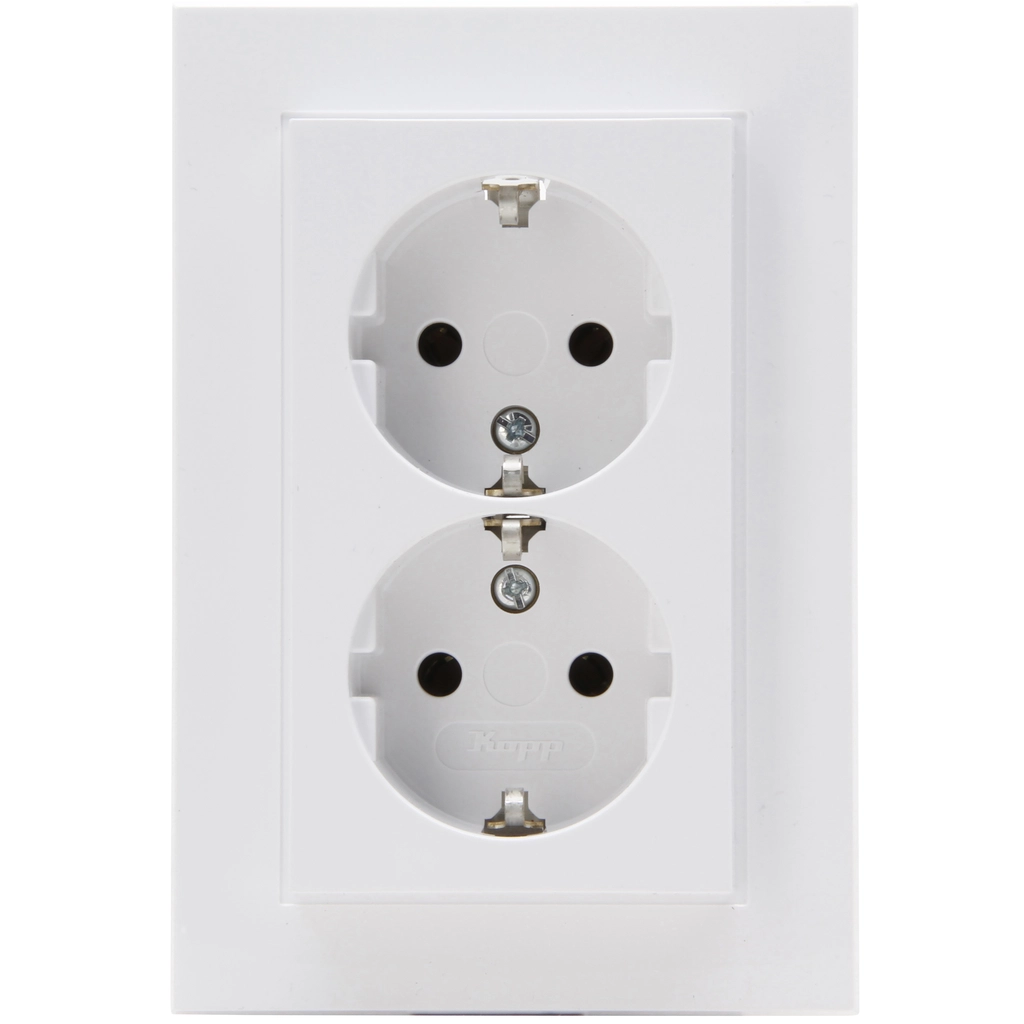 Kopp dubbel stopcontact met randaarde, HK07, arctic wit glans (RAL 9016). Geschikt voor een enkele (ronde) inbouwdoos. Bedrading aansluiten met steekklemmen.