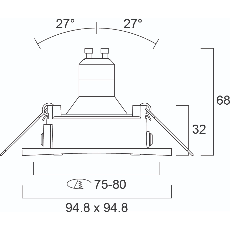 Sylvania Inset Trend 75 Swing vierkante inbouwspot met GU10 fitting, 27° kantelbaar. Materiaal behuizing: aluminium, kleur: zwart. Afmeting front: 94,8 x 94,8 mm, inbouwdiepte: 68 mm, boorgat: 75-80 mm. IP44, uitsluitend geschikt voor binnengebruik. Wordt geleverd zonder lichtbron.