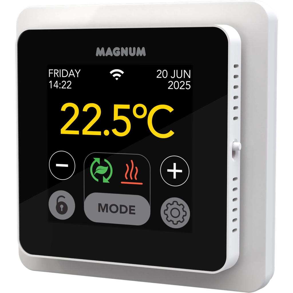 De MAGNUM Heating Remote Control 2 (MRC2) is een slimme WiFi-thermostaat voor elektrische vloerverwarming met helder touchscreen en bediening via smartphone app. Dankzij de ECO-modus met aanwezigheidssensor en de zelflerende opwarmfunctie wordt energie efficiënt gebruikt zonder in te leveren op comfort. De thermostaat biedt instelbare dagprogramma’s, een nachtmodus met gedimd display en temperatuurbegrenzing voor gevoelige vloeren zoals hout. Bediening is mogelijk via WiFi en automatische updates en spraakbediening worden ondersteund. Voor nauwkeurige regeling beschikt hij over een vloersensor en ingebouwde luchtsensor. Max. belasting: 16 A. Geschikt voor montage in inbouwdoos met minimale inbouwdiepte van 50 mm.