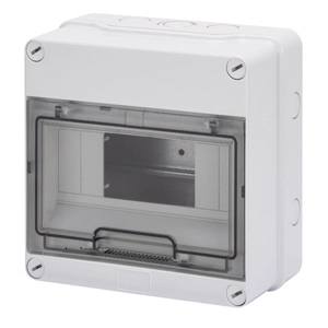 Kunststof opbouwkast met DIN-rail en transparante deur, uitgevoerd in IP55. Voor 8M, met afmetingen 180x180x98 mm en RAL 7035. Meer informatie »