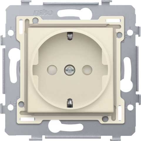 Samengesteld tweepolig stopcontact 16 A 250 V sokkel en afwerkingsset, met randaarde en centraalplaat met beschermingsafsluiters inbouwdiepte 28,5 mm. Het stopcontact bevat contactbussen met een groot contactoppervlak die niet op de sokkel steunen om te klemmen en insteekklemmen met ontgrendelingen. Deze ontgrendelingen zijn langs de voorzijde met de hand of met een schroevendraaier te bedienen. Afwerkingskleur: cream