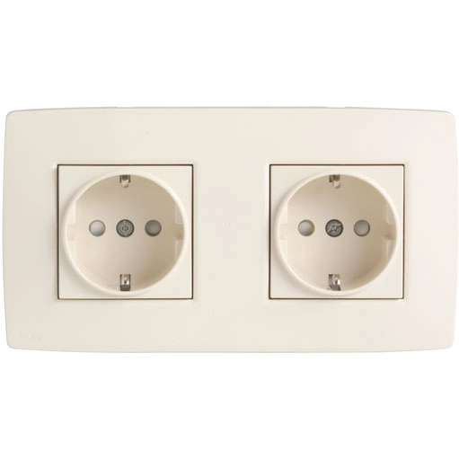 Samengesteld tweevoudige voorbedraad tweepolig inbouwstopcontact 16 A 250 V sokkel, centraalplaat en afwerkingsset, met randaarde, beschermingsafsluiters en tweevoudige afdekplaat. De stopcontacten bevatten contactbussen met een groot contactoppervlak die niet op de sokkel steunen om te klemmen en insteekklemmen met ontgrendelingen. Deze ontgrendelingen zijn langs de voorzijde met de hand of met een schroevendraaier te bedienen. De afwerkingsset is bij levering reeds vastgeschroefd op de sokkel, wat een zeer snelle installatie mogelijk maakt. Afwerkingskleur: cream