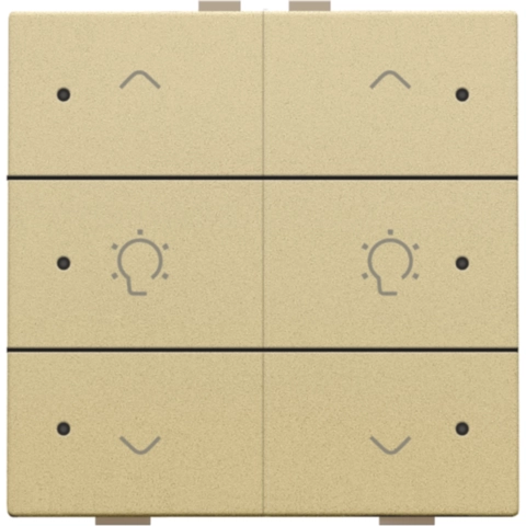 Het design van de Niko dimbediening 2-voudig met LED en symbool voor Niko Home Control gold coated (221-52046) is een echte blikvanger. De centraalplaat is afgewerkt met een stijlvolle gouden lak, die je interieur een elegante en warme uitstraling geeft. Maar het is meer dan alleen een mooi gezicht. De bovenste en onderste toetsen zijn uitgerust met een subtiele, amberkleurige LED. Deze ledjes geven de status van de verlichting aan, zodat je in één oogopslag ziet of een lamp is ingeschakeld. Je kunt deze feedbackfunctie eenvoudig programmeren via de Niko Home Control software.