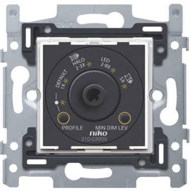 Universele draaiknopdimmer met CAB-ontstoring, 2-draads aangesloten met een vermogen van 3 tot 300 W. Een dimmerknop (XXX-31003) en afdekraam in een kleur naar keuze moeten afzonderlijk besteld worden.