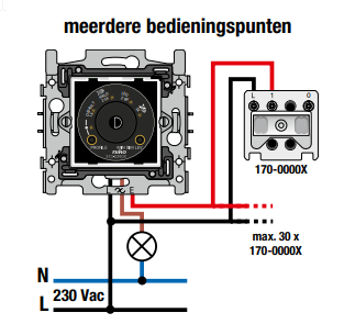 Let op: de dimmer heeft geen spreidklemmen/klauwbevestiging en kan daarom alleen met schroeven in een inbouwdoos worden gemonteerd.