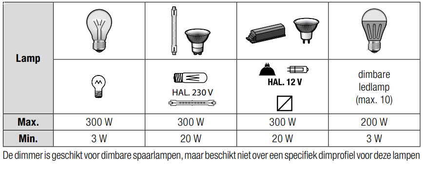 Maximale belasting 230V-halogeenlampen: 300 W