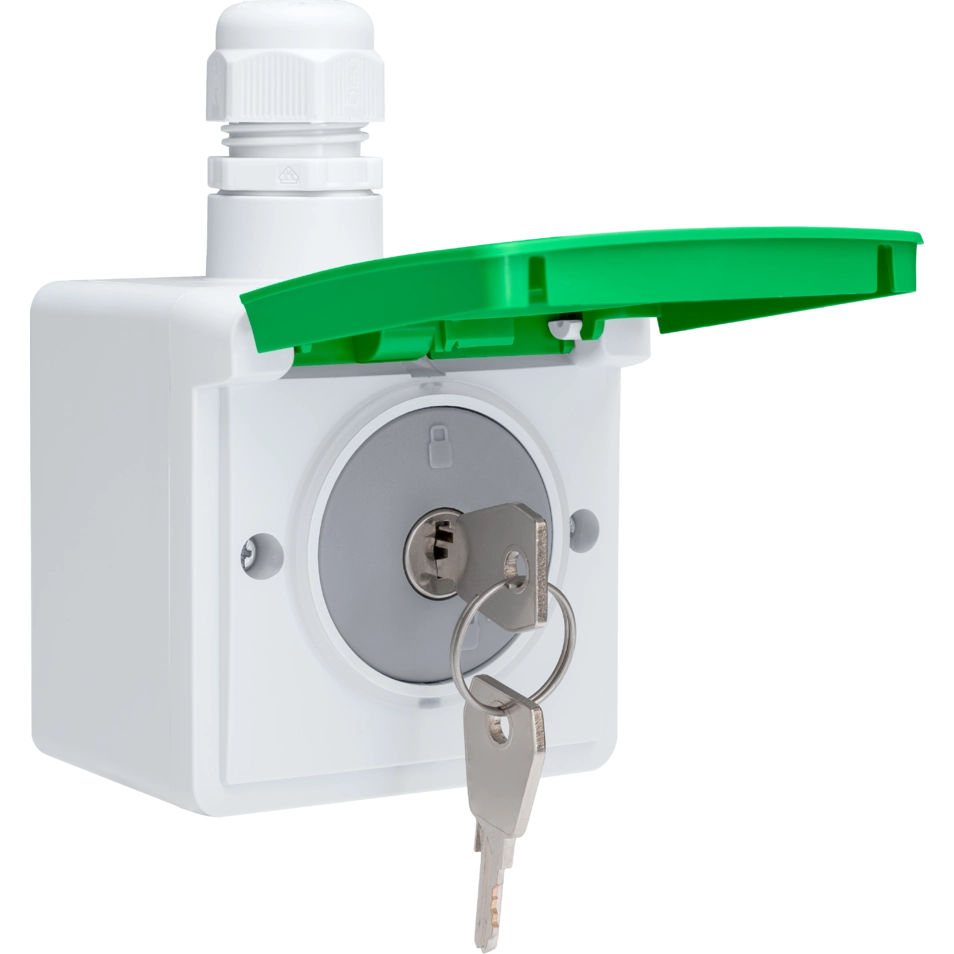 Niko Hydro spuitwaterdichte fietslaadcontactdoos 16 A / 250 V met randaarde en aanraakbeveiliging, geleverd met opbouwbak, M20-invoer, wartel en afsluitbaar slot tegen ongewenst gebruik. Kleur groen/grijs.