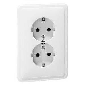 Tweevoudige verticale stopcontact met randaarde en verhoogede aanraakbeveiliging (kindveilig). Let op past alleen in een ovale inbouwdoos en niet in een standaard ronde inbouwdoos. Serie: Standard. Kleur: levend wit (RAL 9010).