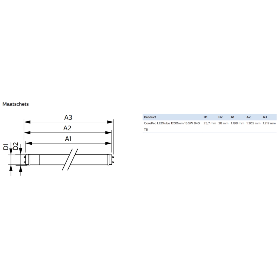 Philips CorePro LED TL-buis G13, 15,5 Watt (vervangt 36 Watt conventionele tl-buis), T8, Lichtkleur: 4000 Kelvin (koel wit), bundelhoek: 240 graden, lumen: 1800. Lengte: 1200 mm, diameter: 28 mm. Niet dimbaar!