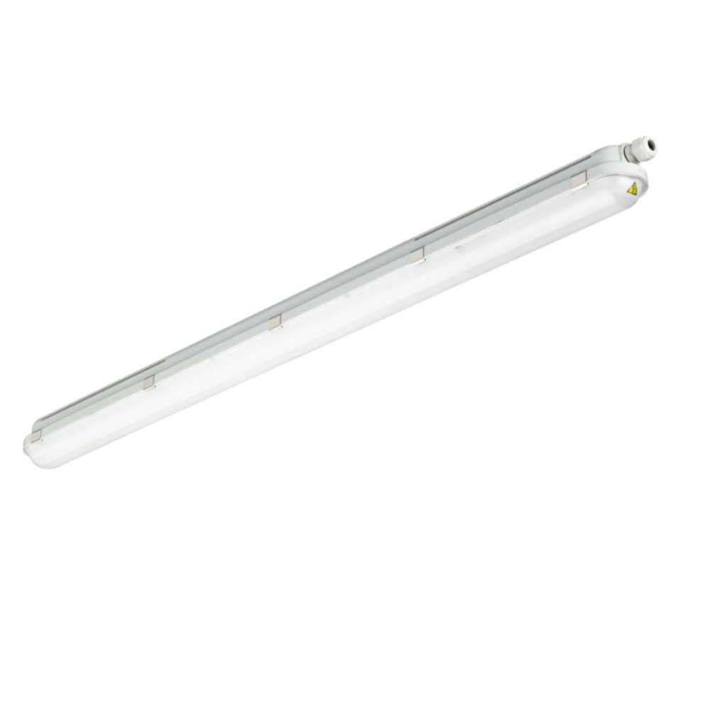 CoreLine waterdicht TL-armatuur (IP65) met niet-vervangbare LED TL-buis en heldere kap. Dankzij de MultiLumen-functie instelbaar op 18 Watt (2700 lumen) of 32 Watt (4500 lumen). Afmetingen (l x b x h): 1215 x 80 x 76 mm. Niet dimbaar!