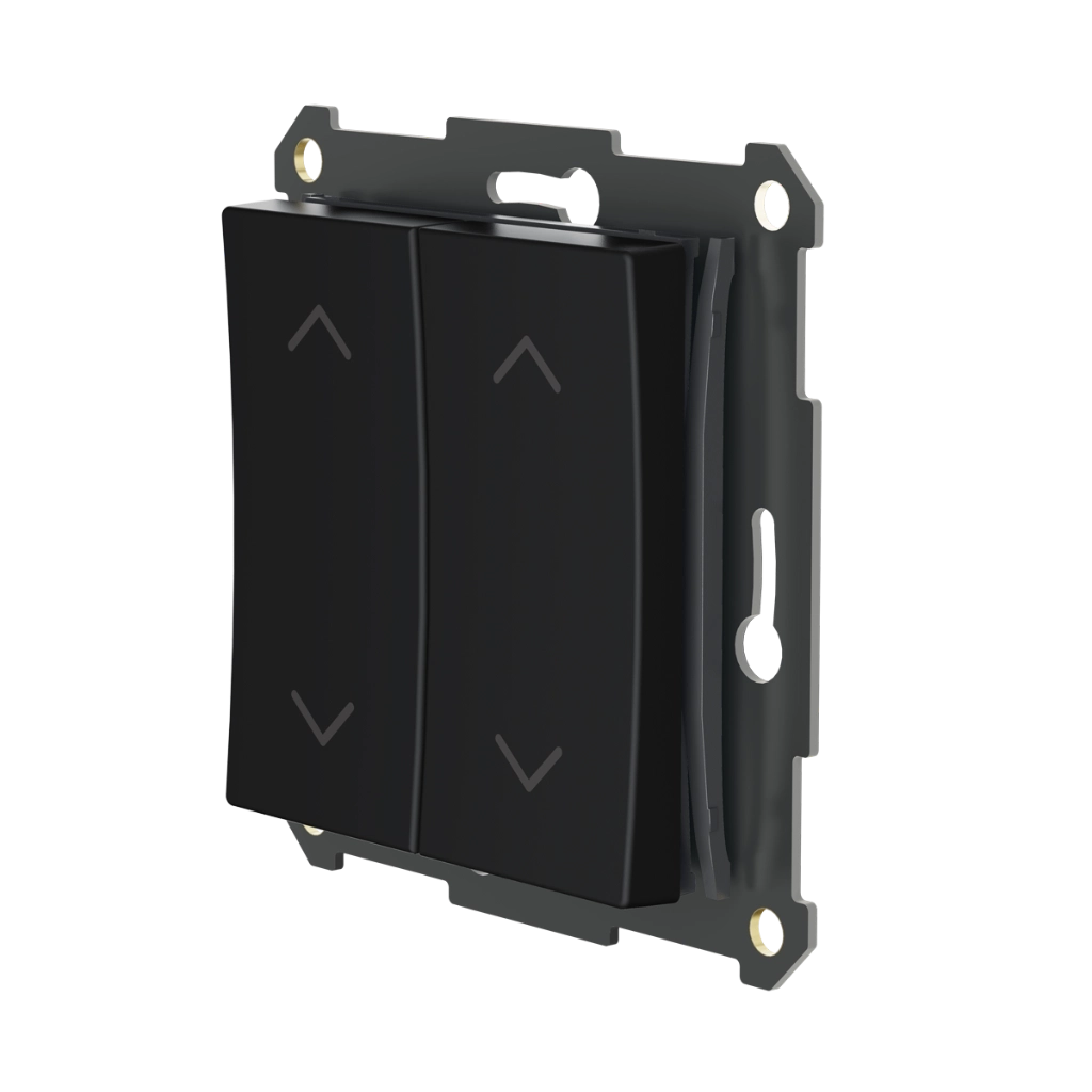 Wandzender, 1- of 2-voudig met pijlsymbolen. Deze pulsdrukker maakt draadloze bediening van één of meerdere Plejd-producten mogelijk. Kan worden bevestigd met dubbelzijdige tape, schroeven of in een standaard inbouwdoos. Zowel een enkele als dubbele wip wordt meegeleverd.