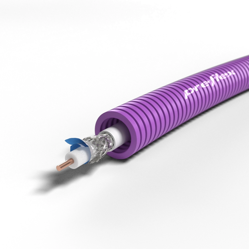 Flexibele buis voorbedraad met COAX kabel. Diameter van de buis 16 mm, flexibel, Polypropyleen (PP), grijs. Rol van 100 meter. Meer informatie »