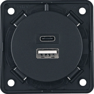 Hager Berker USB-oplaadcontactdoos, 1x USB-A en 1x USB-C, 230V. Totale uitgangsstroom max. 3,0 A. Serie Integro Flow in mat antraciet. Ideaal voor o.a. (bad)meubels, caravans en boten. Niet geschikt voor standaard muurmontage.Meer informatie »