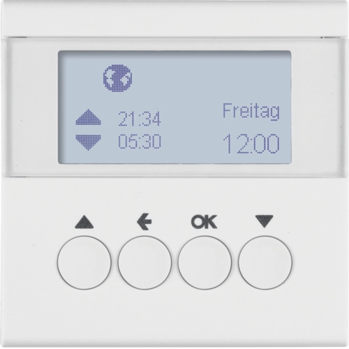 Hager Berker schakelklok opzetmodule voor jaloeziebesturing, S1/B3/B7, wit mat. Handmatige, tijdgestuurde en automatische jaloezie- en rolluikbediening. Niet geschikt voor verlichting. Excl. binnenwerk en afdekraam. Meer informatie »