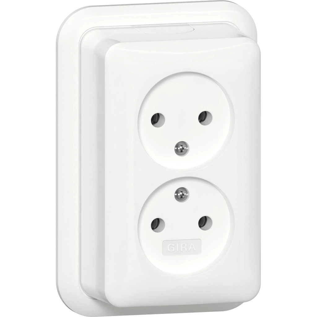 Gira opbouw 2-voudige stopcontact zonder randaarde, wit. Compleet met montageplaat en adapter K/P25.Meer informatie »