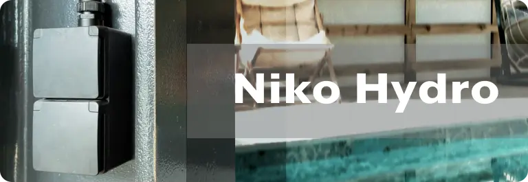 Niko Hydro is een programma van stofdicht en spuitwaterdicht schakelmateriaal. Deze serie is speciaal ontwikkeld om veilig schakelaars, drukkers en wandcontactdozen te kunnen aansluiten in de buitenlucht en natte ruimtes. De IP55-beschermingsgraad staat garant voor een goede, veilige en betrouwbare werking, ook in vochtige omgevingen. Het is zowel als opbouw- en als inbouwschakelmateriaal toe te passen.
