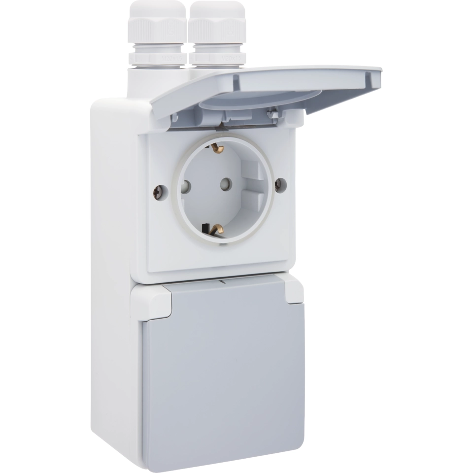 Niko Hydro wandcontactdoos 2-voudig met randaarde, verhoogde aanraakbeveiliging, insteekklemmen en beschermklep. Het is voorbedraad en gemonteerd in een dubbele opbouwdoos (verticaal) met twee M20-ingangen met wartels. Het geheel is spuitwaterdicht.Meer informatie »