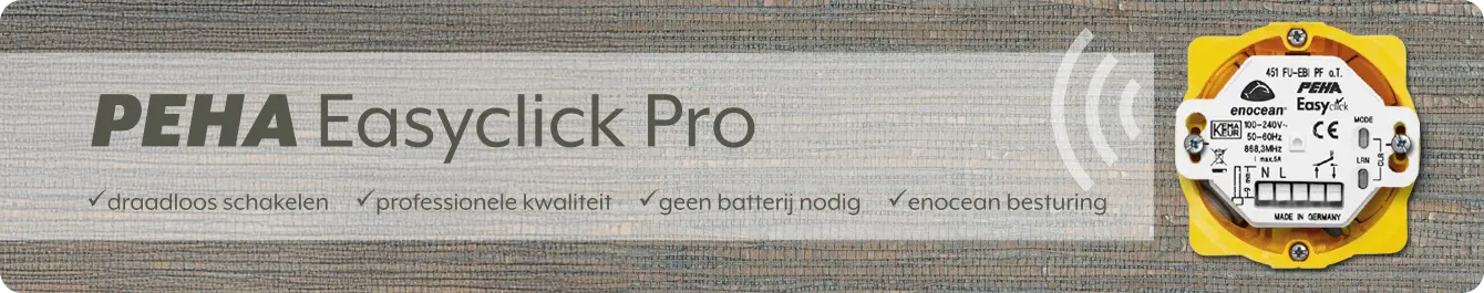 Steeds meer klanten zoeken naar slimme oplossingen voor hun woning, maar de overstap naar een volledig smart home kan ingewikkeld en kostbaar zijn. Dankzij de EnOcean-technologie in PEHA Easyclick Pro is die stap kleiner en toegankelijker. Klusspullen.nl biedt daarom een ruim assortiment PEHA Easyclick Pro-producten: van wandzenders in diverse designseries tot ontvangers voor verlichting, rolluiken en dimmers. Heb je vragen over de juiste combinatie van zenders en ontvangers? Onze klantenservice helpt je graag verder.