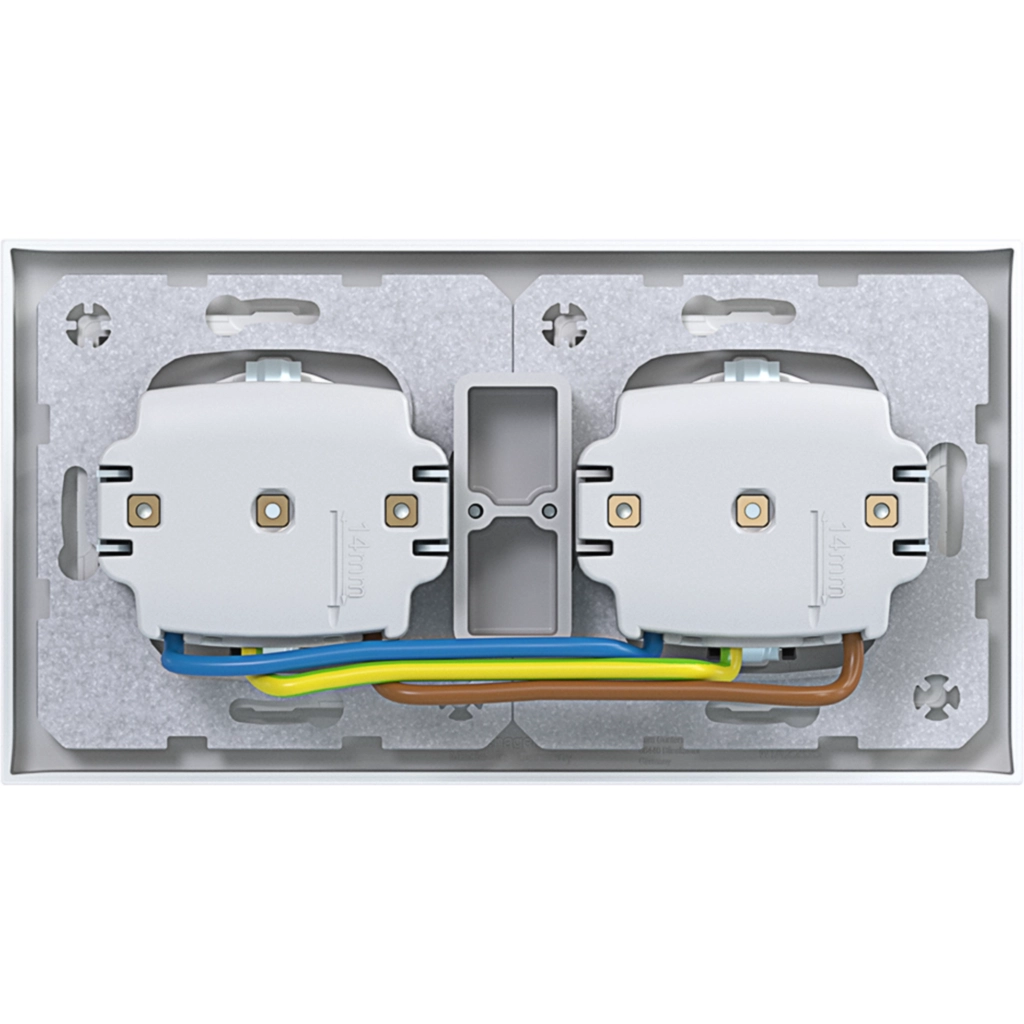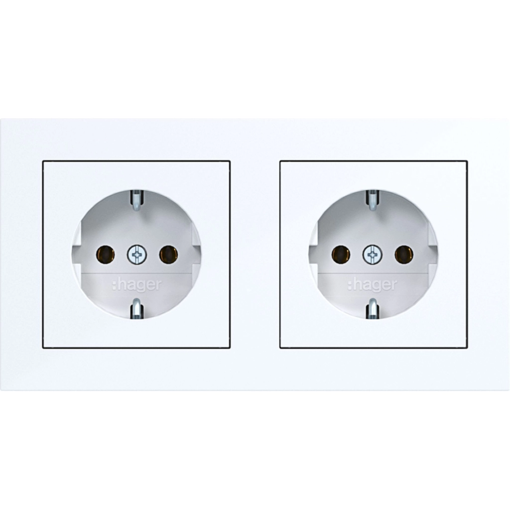 Hager Berker dubbel stopcontact met randaarde, voorbedraad en incl. afdekraam A.1, lichtwit glans. Geschikt voor tweevoudige (duo-)inbouwdoos, past niet in twee enkele inbouwdozen. Met klauwbevestiging (spreidklemmen).