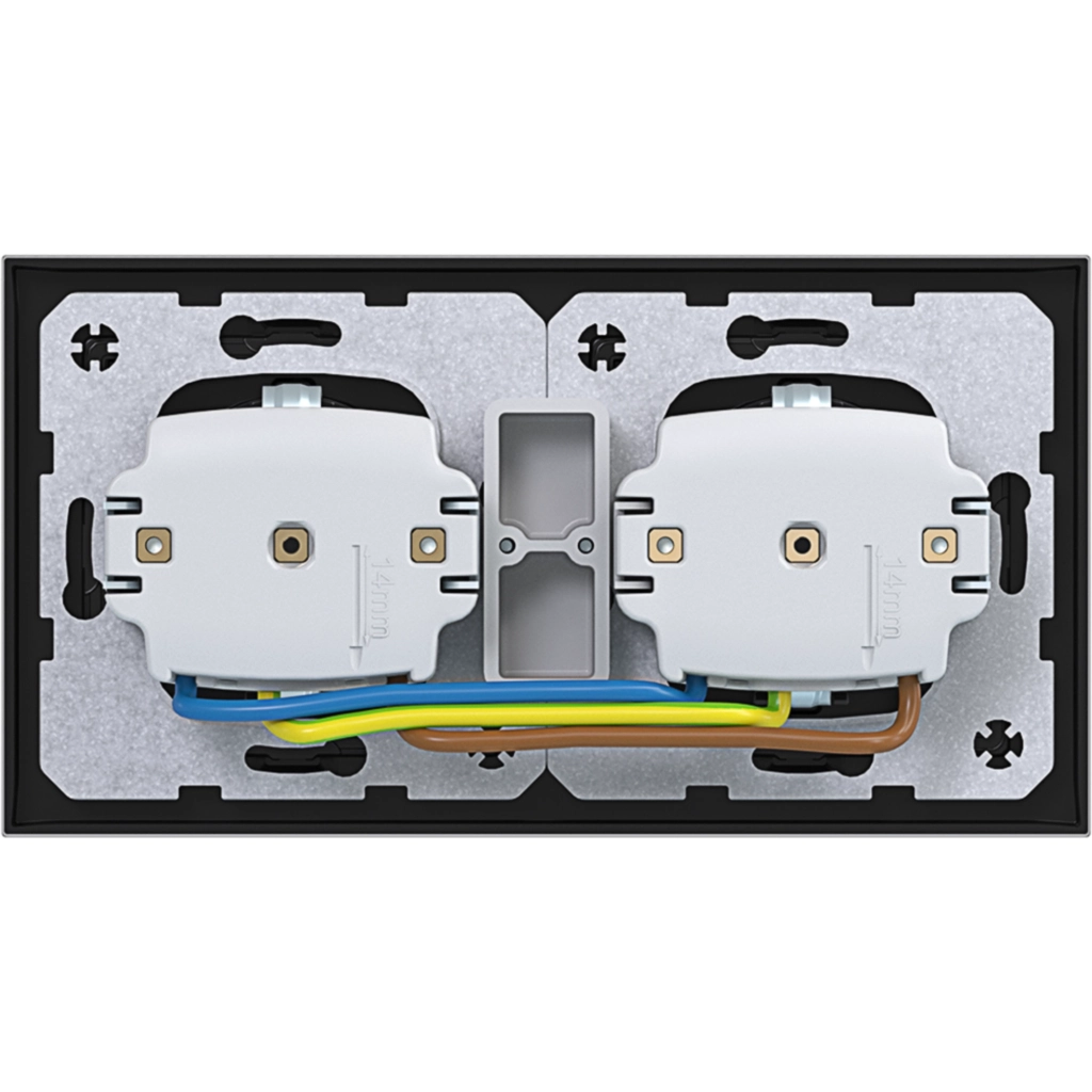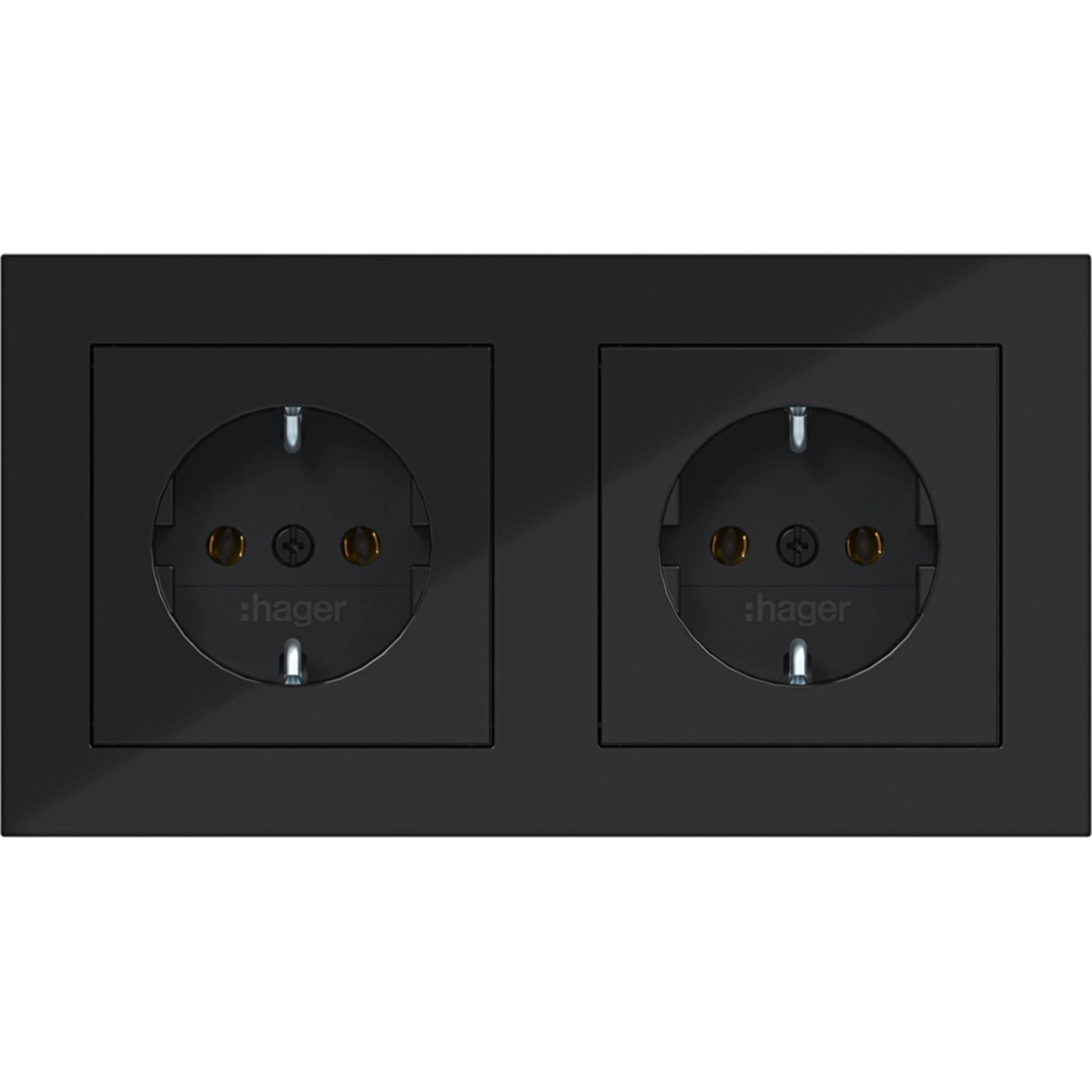 Hager Berker dubbel stopcontact met randaarde, voorbedraad en incl. afdekraam A.1, nachtzwart glans. Geschikt voor tweevoudige (duo-)inbouwdoos, past niet in twee enkele inbouwdozen. Met klauwbevestiging (spreidklemmen).