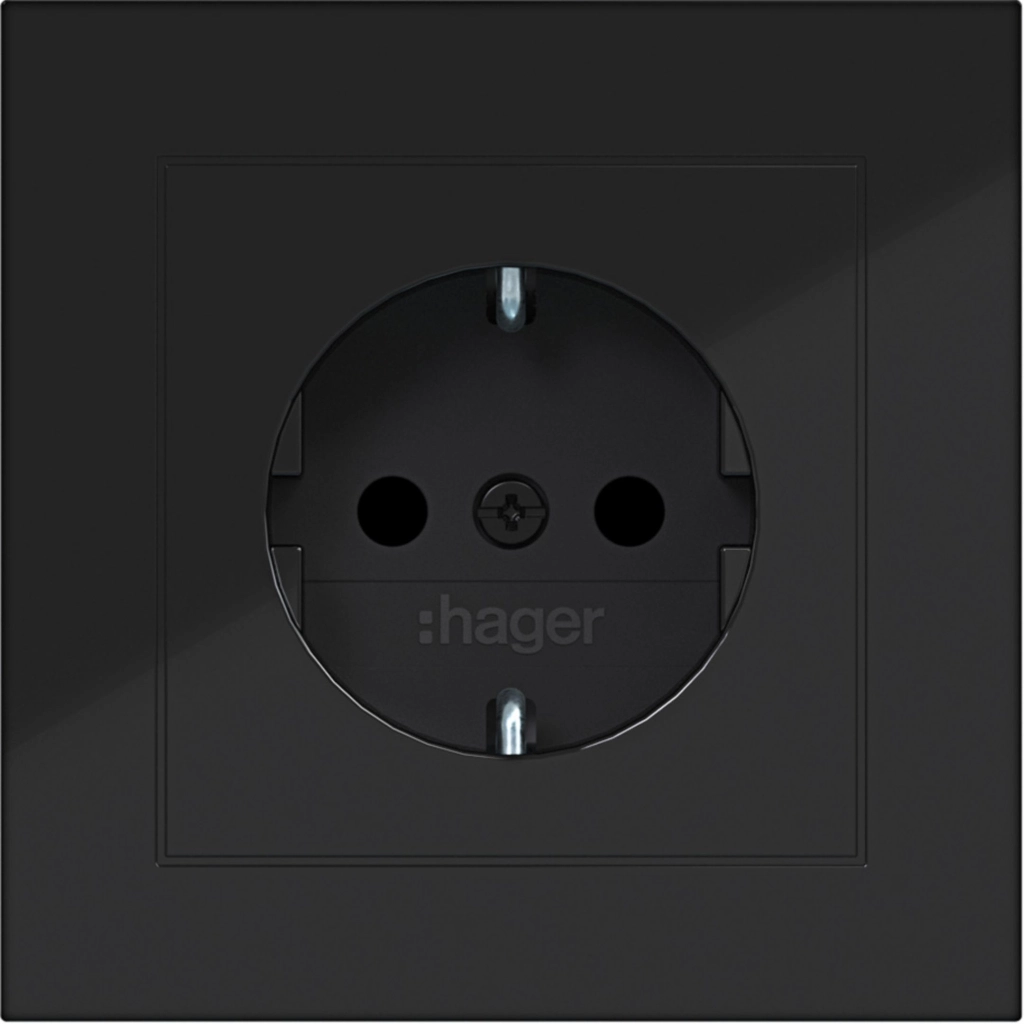 Hager Berker randaarde stopcontact met verhoogde aanraakbeveiliging en volle afdekplaat, voor afzonderlijke montage. Met klauwbevestiging/spreidklemmen. Incl. afdekraam A.1, nachtzwart glans.