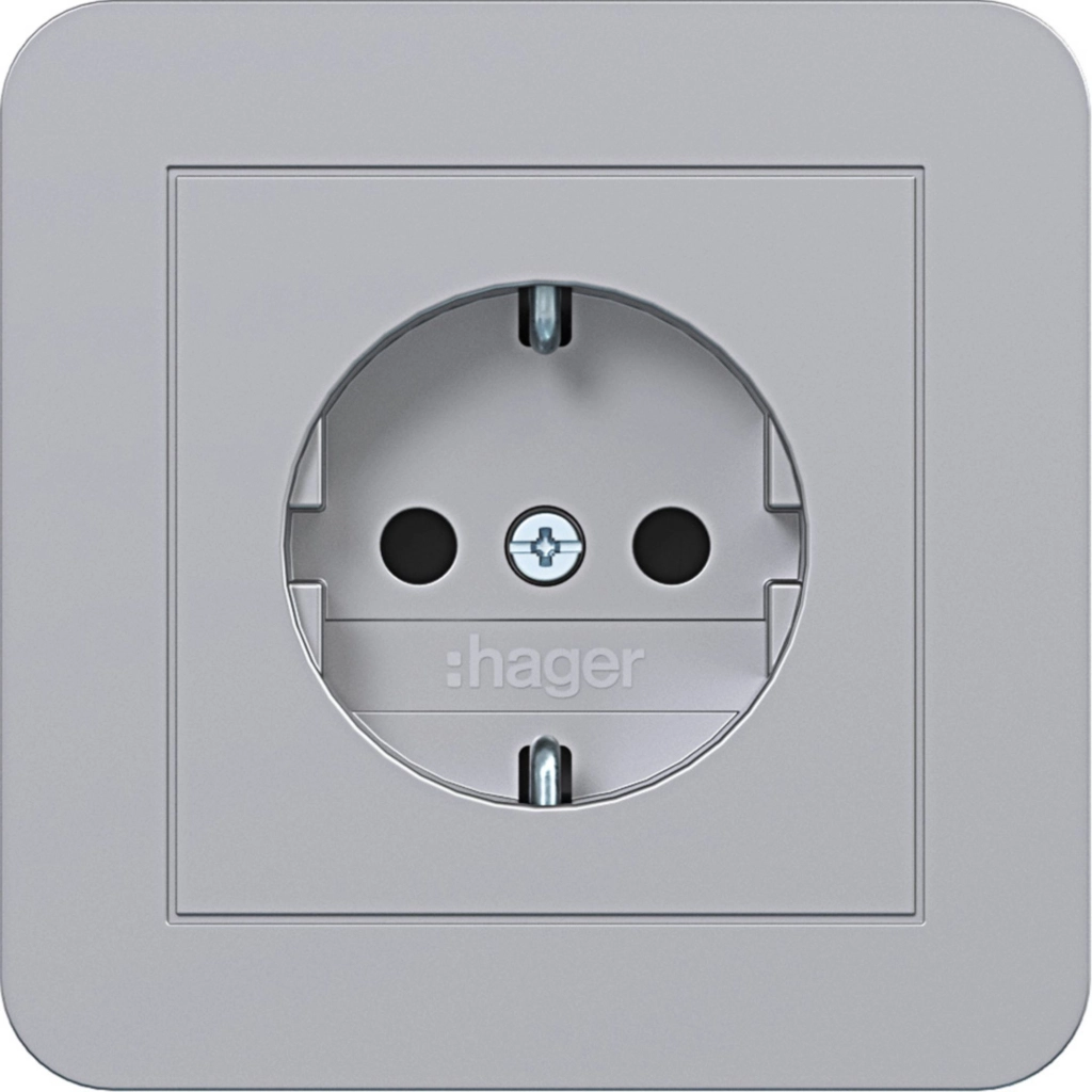 Hager Berker randaarde stopcontact met verhoogde aanraakbeveiliging en volle afdekplaat, voor afzonderlijke montage. Met klauwbevestiging/spreidklemmen. Incl. afdekraam C.1, titaan metallic. Gelakt thermoplast.