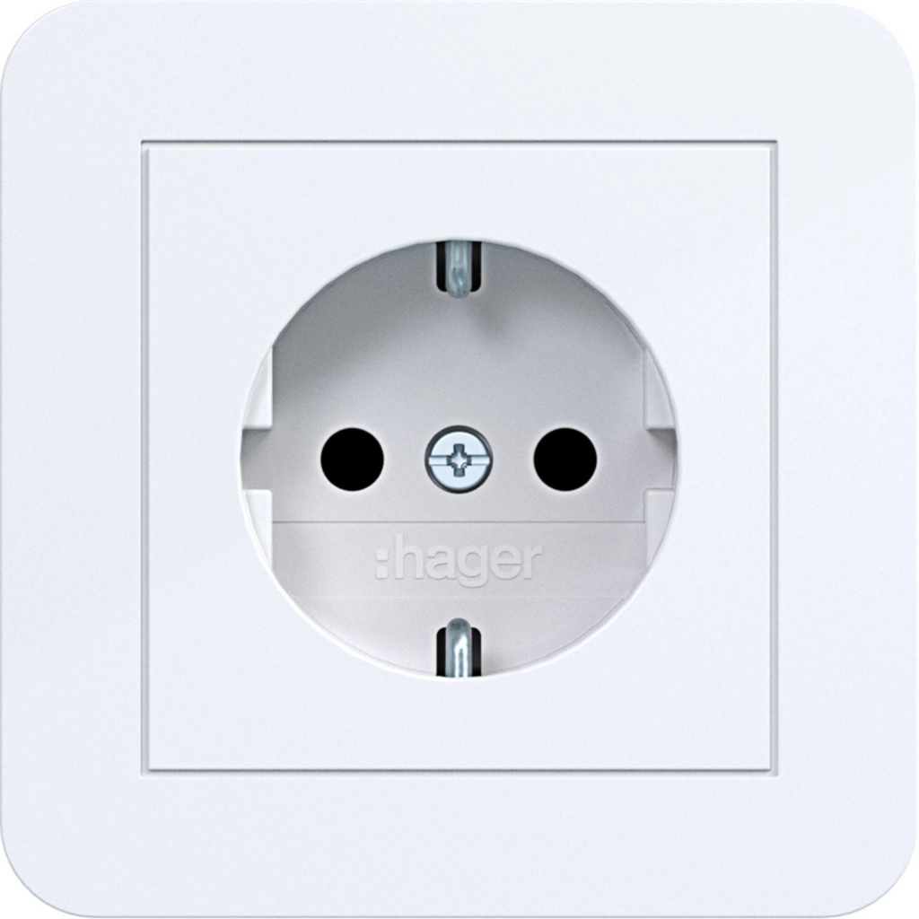 Hager Berker randaarde stopcontact met verhoogde aanraakbeveiliging en volle afdekplaat, voor afzonderlijke montage. Met klauwbevestiging/spreidklemmen. Incl. afdekraam C.1, lichtwit glans.