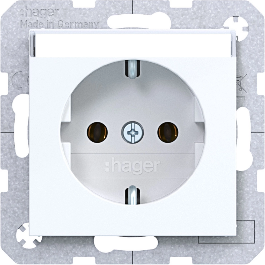 Hager Berker randaarde stopcontact met tekstveld, A.1/A.8/C.1/C.8, lichtwit glans. Met klauwbevestiging/spreidklemmen. Excl. afdekraam.