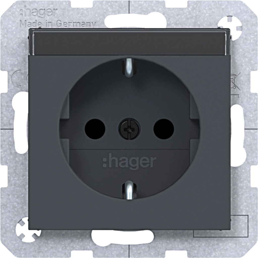 Hager Berker randaarde stopcontact met verhoogde aanraakbeveiliging en tekstveld, A.1/A.8/C.1/C.8, antraciet mat. Met klauwbevestiging/spreidklemmen. Excl. afdekraam.