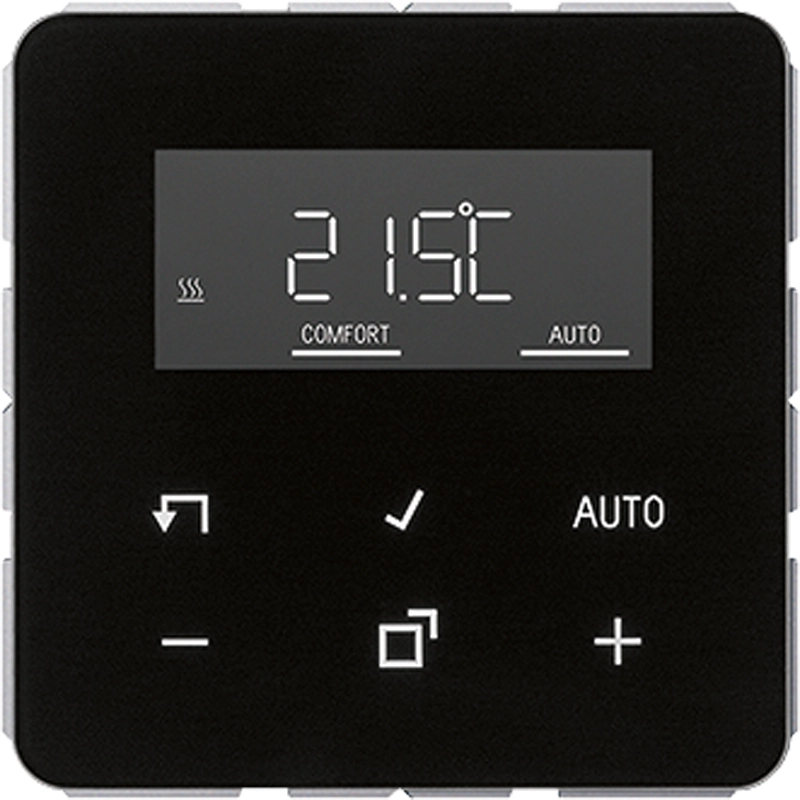 JUNG kamerthermostaatset met display en binnenwerk. Voor handmatige en tijdgestuurde regeling van de ruimtetemperatuur, CD 500, zwart. Front van echt glas. Excl. afdekraam. Meer informatie »