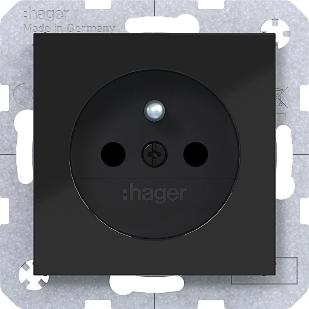 Hager Berker stopcontact met penaarde (België) en verhoogde aanraakbeveiliging, A.1/A.8/C.1/C.8, nachtzwart glans. Met klauwbevestiging/spreidklemmen. Excl. afdekraam.