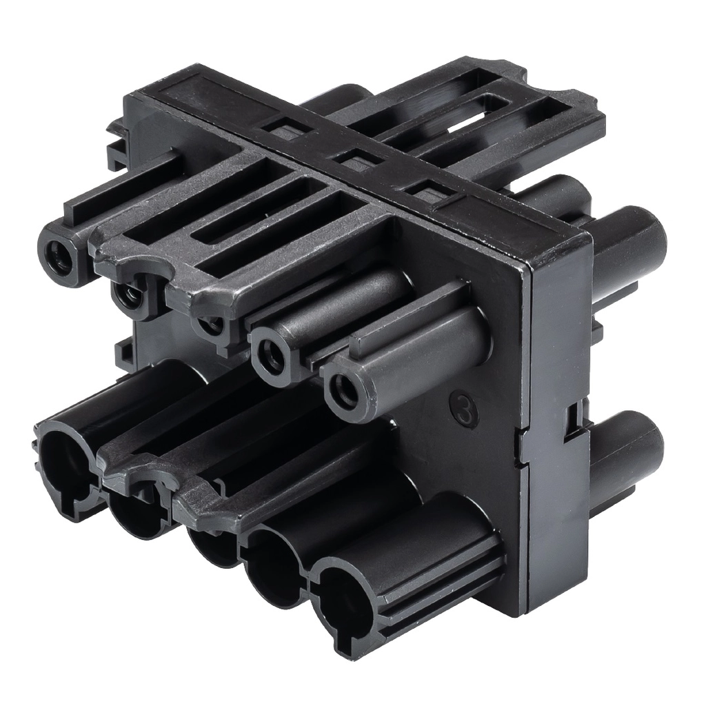 H-verdeler gebouwinstallatie, 5-polig, 1x in, 3x uit, 20A, 250V, Polen: 3, N, PE, 2, 1, Kleurcodering; Zwart, Vergrendeling Geïntegreerd in plug-in connector, Halogeenvrij, IP20,... Meer informatie »