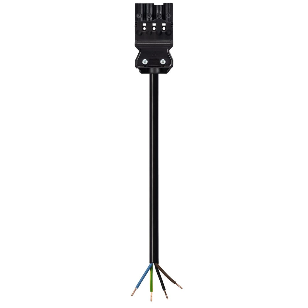 Deze aansluitkabel is geschikt voor het veilig aansluiten van apparatuur binnen gebouwinstallaties. Voorzien van een vrij kabeluiteinde en een stekker (male), uitgevoerd in een 4-polige configuratie met een aderdoorsnede van 1,5 mm². Met een lengte van 0,5 meter en het flexibele H05VV-F)-kabeltype is deze kabel geschikt voor 250V-toepassingen tot 16A. De zwarte mantel en zwarte codering zorgen voor een nette, onopvallende afwerking. De connector beschikt over vergrendeling voor een stevige aansluiting en het vrije uiteinde is duidelijk gemarkeerd met 2, N, PE, 1 voor snelle en foutloze montage.